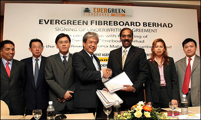 IPO Watch by Goi Tee Ching Main board-bound Evergreen Fibreboard Bhd is investing another RM40 million to restore a factory in Thailand it had bought in February 2005 for RM75 million. Managing director and chief executive officer Kuo Jen Chang said by June this year, the Hat Yai factory will have a full capacity of making 350,000 cu m of medium density fibreboard (MDF) per annum. This is more than double the output of the current 160,000 cu m for MDF a year. "Our Johor factories are already producing 240,000 cu m per annum. We hope with this additional production; we will see RM520 million revenue by December 2005. "It'll be a 30 per cent growth from 2004's estimated sales of RM400 million." he added. Established in the 1970s, Johor-based Evergreen Fibreboard's core business in making MDF has also included particleboard and complete-knocked-down furniture. The group, whose headquarters and main manufacturing site are located on a 10.12ha in the Parit Raja Industrial Estate, also has three production facilities in Johor (two in Pasir Gudang and one in Segamat) and an overseas venture in Thailand. Apart from CKD furniture, MDF is also used in women's high heels and interior shelvings of motor vehicles. Kuo was speaking to reporters in Kuala Lumpur after signing an underwriting agreement with Aseambankers as the adviser, sole placement agent and managing underwriter for Evergreen Fibreboard's public issue of 93.66 million new shares of 25 sen each. |